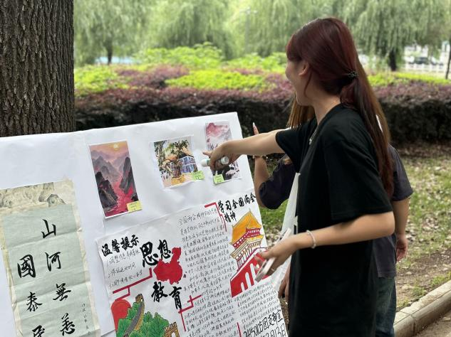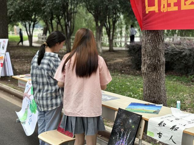 下午14:30,书画展正式拉开帷幕。湖畔游人如织,同学们纷纷驻足观赏,沉浸式感受艺术魅力。现场,团总支工作人员化身为热情的讲解员,为大家介绍一幅幅作品。观展过程中,同学们时而驻足交流,时而拍照留念,在艺术的熏陶中感悟初心与使命。