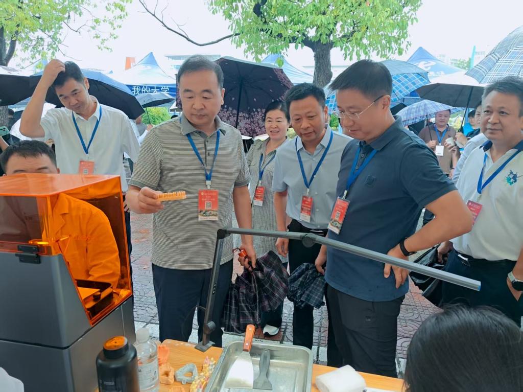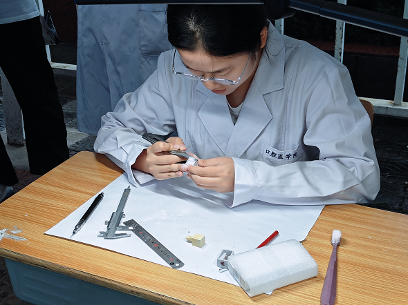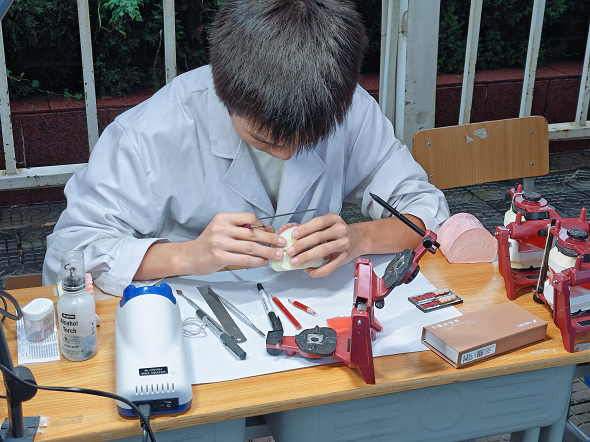 除了3D打印区,学院还设置“石膏牙雕刻演示台”和“全口义齿排列互动角”:学长学姐穿着白大褂,现场演示1:1石膏牙的雕刻过程,从勾勒轮廓到细修牙尖,每一步都讲解解剖原理;新生可亲手触摸仿真牙列模型,在老师指导下识别牙体结构。“以前觉得‘看牙’很简单,今天才知道每颗牙齿的沟窝、牙尖都有讲究。”新生张韬说,专业展示让他对“口腔医生”的认知从“治病”变成了“用技术守护细节”。