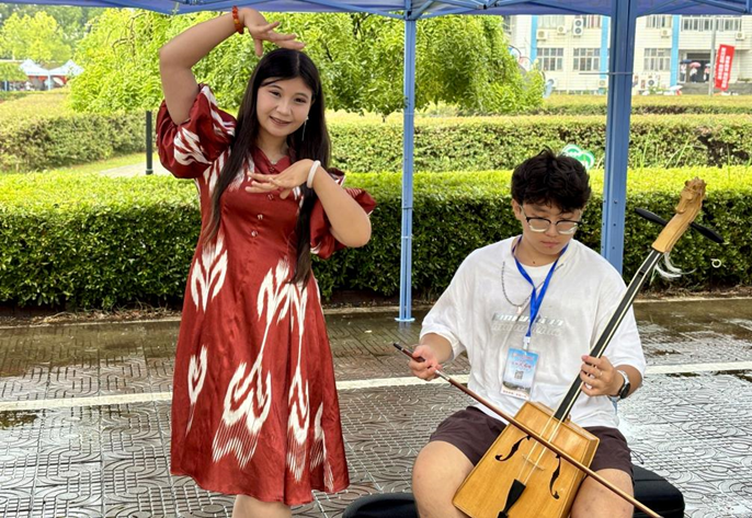 接待处对面,来自蒙古族的学长张硕拉起悠扬的马头琴,来自维吾尔族的学姐凯丽比努尔·麦麦提尼亚孜跳起欢快的舞蹈,这都是为了让学弟学妹们感受到学院的热情,熟悉的民族旋律与舞蹈吸引了众多新生驻足欣赏。悠扬琴声与轻快舞步相映,专业元素与多元文化交融,让新生在热闹中感受到学院的满满诚意与温暖。