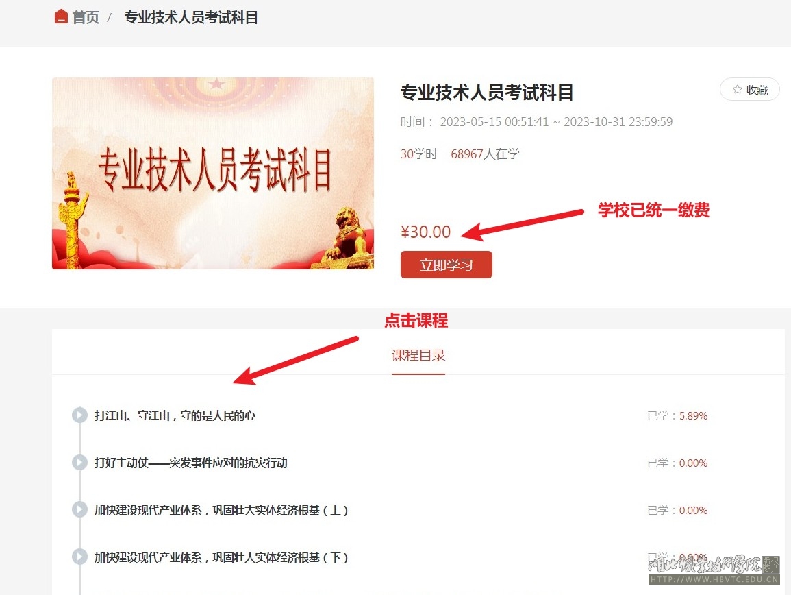 3.选择相应的学习课程进行学习即可(学校已统一完成课程缴费)。