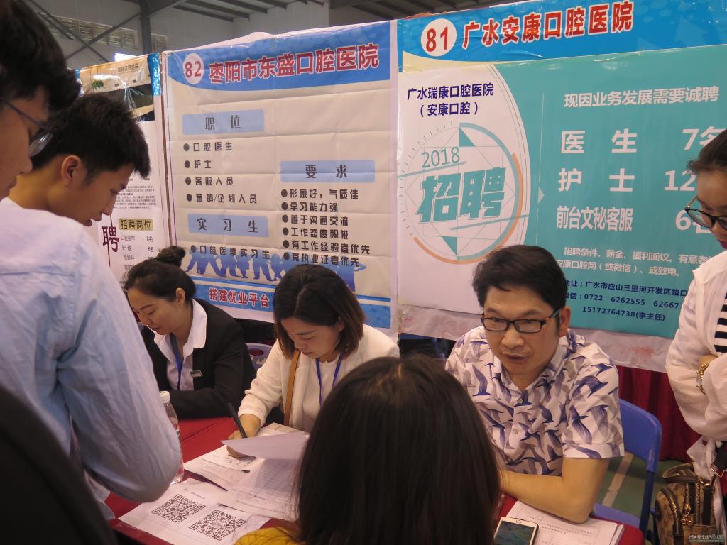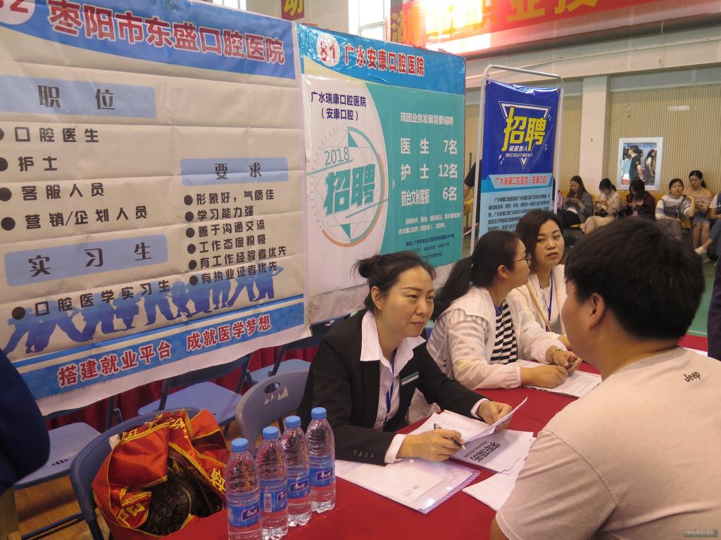 4月28日上午,我校2018年医护类招聘会在东区体育馆内成功举行。此次招聘会共吸引212家企事业单位参会,提供就业岗位5422个,其中招聘口腔医学专业毕业生的综合医院、专业口腔医院、口腔门诊共24家,提供近300个岗位。