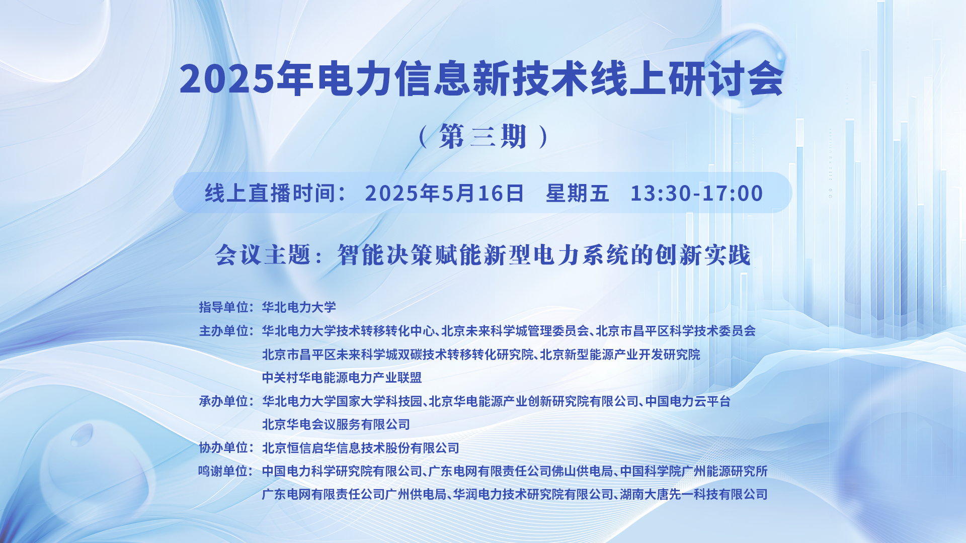 2025年电力信息新技术线上研讨会(第三期)一、讲座主题:智能决策赋能新型电力系统的创新实践 二、讲座时间:2025年5月16日 星期五 13:30-17:00 三、讲座地点:线上直播:https://t19c5.xetlk.com/sl/1KZA7r(联系人李老师 18911662193) 四、主讲人信息: (一)主讲人:李亚平 ...主讲人:李亚平、齐丹、邱桂华、王同贺、孔令明、彭喆、马桂英时间:2025-05-16 13:30地点:线上讲座 -