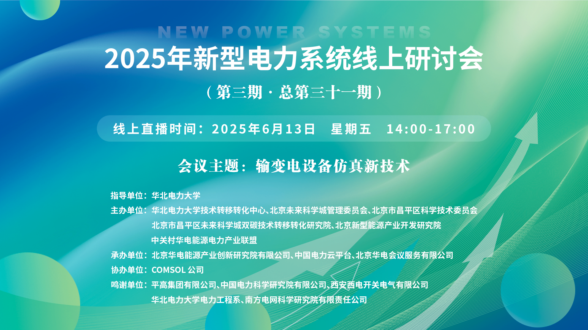 2025年新型电力系统线上研讨会(第三期·总第三十一期)一、讲座主题:输变电设备仿真新技术 二、讲座时间:2025年6月13日 星期五 14:00-17:00 三、讲座地点:线上直播:https://t19c5.xetlk.com/sl/1ggza2(联系人李老师 18911662193) 四、主讲人信息: (一)主讲人:王之军 1.主讲人简...主讲人:王之军、韩没延、刘 栋、管 臣、潘卓洪、程建伟时间:2025-06-13 14:00地点:线上讲座 -